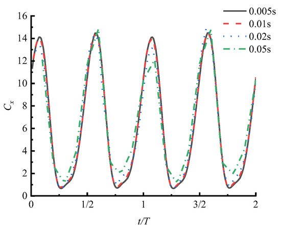 In addition, concerning the verification of independence from the iteration step size, this study selected the numerical model with a grid count of 213,000 mentioned above. Three different time step sizes—0.05 s, 0.02 s, and 0.01 s—were chosen for numerical simulations. The simulation results were extracted for two cycles after the outlet section flow stabilized, as shown in Figure 7. The results show that with a step size of 0.05 s, the curves have more angular corners. This is because a step size of 0.05 s is too large, leading to a significant interval between adjacent data points. However, the curves for iteration step sizes of 0.01 s and 0.005 s almost overlap. It can be observed that after an iteration step size of 0.01 s, computational accuracy is ensured. Therefore, this study chose an iteration step size of 0.01 s for the numerical investigation of the hydrodynamic performance of the flapping hydrofoil bionic pump device.