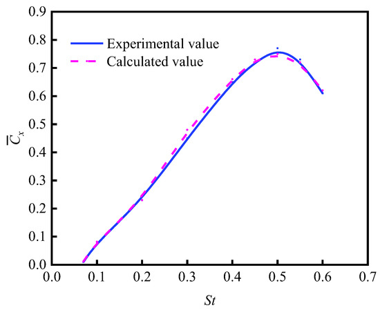 The numerical simulation findings were subsequently compared to the experimental data. This study utilized data from [32] to build a flapping hydrofoil with a chord length (c) of 0.1 m, designed to resemble NACA0012. The area of computation was set at 20c × 15c. The pitching axis of the flapping hydrofoil was located at a point that is one-third of the chord length, at a distance of 5 times the chord length from the inlet boundary. Furthermore, the initial velocity at the inlet was specified as U = 0.4 m/s, the outlet was designated as a pressure outlet, the maximum amplitude of plunging motion was set at Amax = 0.1 m, the phase difference was = 90°, and the pitch angle was αm = 15°, with St being a variable. In a comparison of the numerical calculations under various conditions, the obtained thrust was nondimensionalized and averaged to obtain the average thrust coefficient over one cycle. The comparative results are shown in Figure 8.