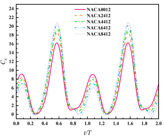 In order to analyze the influence of foil camber on the mechanical performance of flapping hydrofoil bionic pump devices, five sets of hydrofoil models with curvatures ranging from 0% to 8% were selected for simulation and research. The hydrofoil shapes are shown in Figure 3, and the foil parameters are presented in Table 1. The following motion parameters were set: flapping frequency f = 1 Hz, plunging amplitude Amax = 0.15 m, pitching amplitude θ = 30°, distance from the pitching axis to the leading-edge center of the foil l = 0.2c. The pressure inlet was set to zero. By monitoring the outlet section flow velocity and waiting for the motion to stabilize under its working conditions, two flapping cycles of the motions were selected. The instantaneous thrust and lift coefficients of the flapping hydrofoil bionic pump with respect to the wing profile curvature were plotted, as shown in Figure 9 and Figure 10.