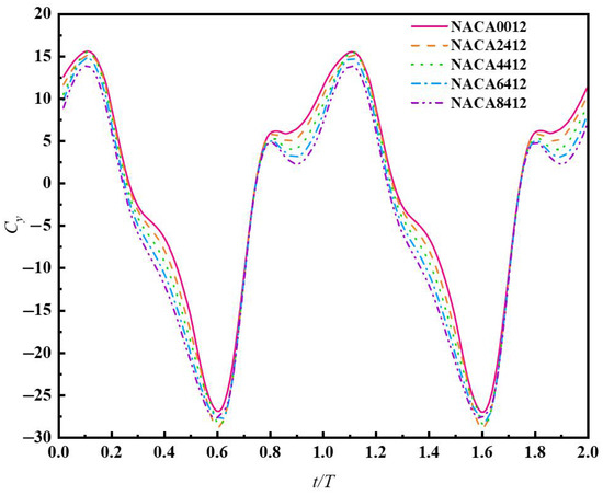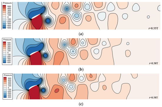 From Figure 9, it can be observed that, within one cycle, the NACA foil’s instantaneous thrust coefficient exhibits two peaks and two valleys. The adjacent peak values of the same foil type differ significantly, but the values of the two adjacent valleys are close. The main reason for this is the asymmetry caused by the relative curvature of the foil. During the flapping hydrofoil motion, the concave surface of the curved foil type concentrates the thrust on the water, while the convex surface disperses the thrust, resulting in a notable disparity between the peak values of the two adjacent instantaneous thrust coefficients. For foils with different curvatures, as the relative curvature of the foil increases, there is a negative correlation between the first peak value of the instantaneous thrust coefficient within the same cycle and the foil curvature, while the second peak value shows a positive correlation with the foil curvature. The reason for this phenomenon is also attributed to the asymmetry in the shape of the foil’s leading edge caused by different curvatures. The difference in thrust concentration between the concave and convex surfaces of the foil is responsible for this behavior. Figure 11 shows that the foils with three different curvatures experience pressure clouds at the moment when the thrust coefficient reaches its maximum value, and the pressure distribution map confirms this observation. Taking the curvature of the NACA6412 foil as the threshold, when the curvature is less than this threshold, the instantaneous thrust coefficient of the flapping hydrofoil is always greater than zero, indicating that the flapping hydrofoil contributes to propulsion throughout the entire process. When the curvature is greater than this threshold, the instantaneous thrust coefficient of the flapping hydrofoil becomes negative, indicating that the hydrofoil experiences resistance from the water flow.
