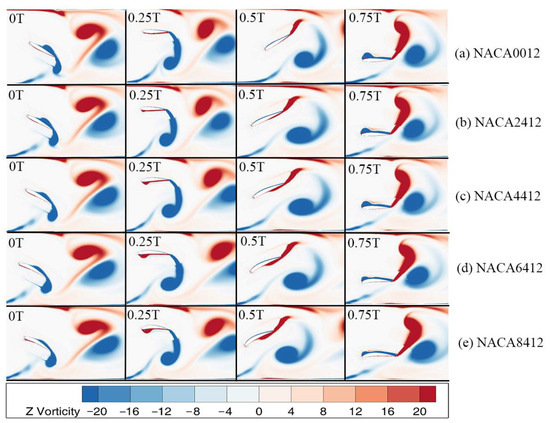 Vorticity maps at different times in one period for hydrofoils with different foil curvatures.