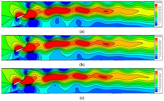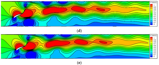 To investigate the correlation between foil curvature and the performance of the flapping hydrofoil bionic pump device, we also consider a flapping hydrofoil oscillation frequency f = 1 Hz. Figure 13 illustrates the velocity distribution of five flapping hydrofoils, each with a different foil curvature, all flapping simultaneously. Upon comparison, it is observed that the distribution of the five velocity flow fields is essentially identical. The flapping motion of the hydrofoil causes an increase in the incoming water velocity and generates a jet at the tail of the hydrofoil. The jet velocity exhibits a decreasing gradient distribution from the middle to the sides of the wall. As the jet propagates forward, it tends to be biased towards the side of the flow channel. However, there is a difference between the NACA8412 and NACA0012 foils. The NACA8412 foil, which has a greater curvature, has a smaller low-velocity zone near the lower side of the wall compared to the NACA0012 foil. In other words, the greater the curvature of the foil, the wider the range of water being pushed longitudinally in the direction of the y-axis. Combined with the analysis of Figure 12, the reason may be that the foil curvature of the flapping hydrofoil is changed to produce an asymmetric vortex in the flapping cycle, which makes the velocity direction of the vortex induced by the tail of the flapping hydrofoil change, and this change slows down the loss of vortex in the vortex in the process of downstream propagation, as can be seen in Figure 13; the NACA0012 foil experiences the fastest decrease in water flow velocity, while the NACA8412 foil experiences the slowest decrease. The curvature of the foil ranges from 0%c to 8%c, and as the curvature increases, the rate of velocity decrease in the x-direction slows down. Additionally, the higher the velocity in the high-speed zone of the intermediate basin, the greater the distance it extends.