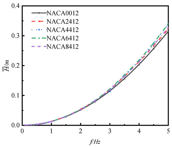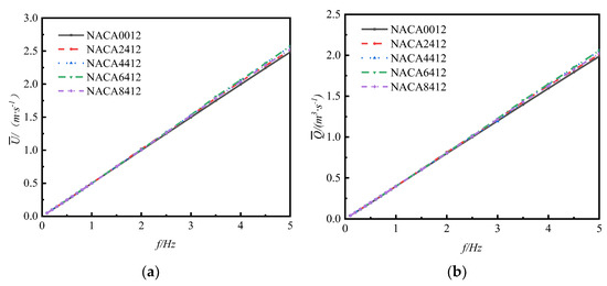 Figure 14 shows the effect of foil curvature on the mean flow velocity () and mean flow rate () of the flapping hydrofoil under the swinging frequency of 0.1 Hz–5 Hz. From the figure, it is evident that the mean flow velocity () and mean flow rate () of the flapping hydrofoil, with five various curvatures, exhibit a direct proportionality to the swinging frequency. Within the range of , and with the same frequency, the curvature of foil has minimal effect on the average flow velocity () and average flow rate (). At frequencies greater than 2.5, and with the same frequency, the curvature of the flap has an impact on both the mean flow velocity () and mean flow rate (). And then the impact becomes more pronounced as the frequency increases. It has been observed that the NACA6412 foil with a curvature of 6%c has the most significant effect in enhancing the mean flow velocity () and mean flow rate () as the swinging frequency increases. On the other hand, the symmetrical NACA0012 foil has the least favorable effect in comparison.