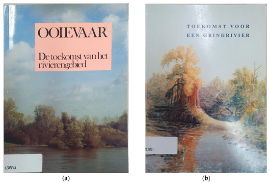 At the same time, the province of Limburg was obliged to supply a large amount of gravel to the national government. Extracting gravel was a sensitive issue in this specific province due to problems with historical deep mining, deep gravel extraction, and other cases of pollution [44]. This part of the Meuse is one of the few places in the Netherlands where gravel can be excavated. The national government put pressure on excavation because the Netherlands had to source a certain amount of gravel from its own territory in order to be able to buy gravel from Germany (pers. comm., prominent project member of local authorities, 22 August 2022). The inability to buy gravel was considered to be a problem for the Netherlands, being a highly infrastructuralised state (pers. comm., a representative from the gravel and sand industry, 19 August 2022). In 1991, the province commissioned the newly emerged consultancy company Bureau Stroming to develop a plan for the development of nature in combination with gravel extraction called “Future for a Gravel River” for this specific trajectory of the Meuse [45]. The covers of the books presenting both this plan and the earlier plan, Stork, carry romantic images of a river with vegetation around it, feeding into both historic and futuristic images of the river as a free, wild, and romantic place (Figure 1a,b).
