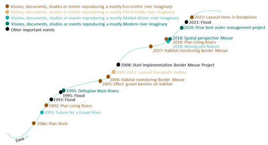 Data were processed through a qualitative thematic analysis based on our interview questions, following grounded theory, which indicates that the researcher interprets qualitative data through an inductive process in order to build a theoretical understanding of observations in practice. In this process, the researchers’ own presence and interpretations unquestionably influence the results at every stage of the research process. Inspired by a ‘follow the money approach’ and the work of Sara Hamilton [39], we first identified the imaginaries and truth regimes at work in a ‘follow the knowledge making’ process, where we followed the date, uptake, and trust building of specific visions and related knowledge products mentioned during the interviews. This resulted in a detailed timeline of local river knowledge production and related future visions, developed by specific stakeholders. In the analysis, 15 river and climate adaptation documents/visions, 2 legal processes, 3 news articles, 2 websites, and 3 flooding events were selected to demonstrate this process.