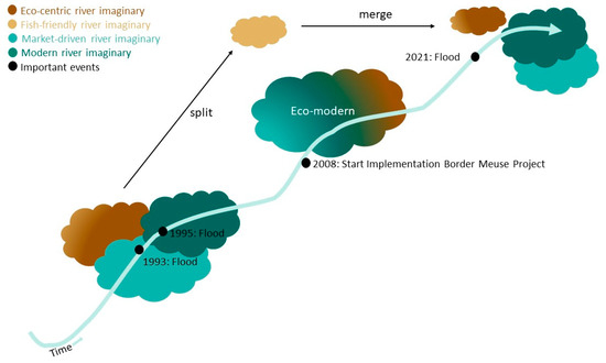 Illustration of the dynamics of the river imaginaries over time, highlighting important events in the Border Meuse. In the floods of 1993 and 1995, three imaginaries moved toward each other and started negotiating toward an eco-modern river imaginary. Yet, during this time, the fish-friendly imaginary split from the eco-centric imaginary. After the 2021 floods, the eco-centric imaginary split off from the modern and market-driven imaginaries.