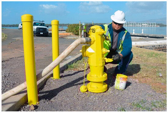 - Haw. Code R. § 12-45.2-92—Required Water Supply for Fire Protection. Available online: https://www.law.cornell.edu/regulations/hawaii/Haw-Code-R-SS-12-45-2-92#:~:text=Section%2018.3.,into%20or%20within%20the%20county (accessed on 8 February 2024).