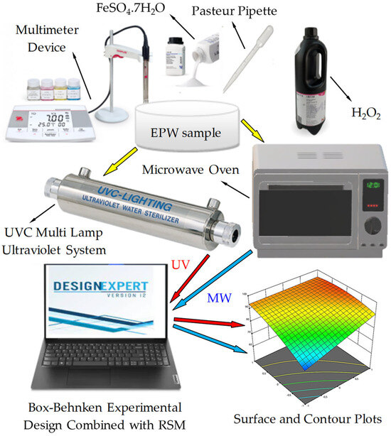 Based on the foregoing facts, the specific objectives of this study are as follows: (1) to characterize real EPW with low biodegradability for advanced Fenton oxidation studies; (2) to perform a series of treatability studies using UV- and MW-assisted Fenton processes as an advanced oxidation method and to compare their performance in the same wastewater; (3) to employ a three-factor, three-level Box–Behnken experimental design combined with RSM for maximizing the chemical oxygen demand (COD) and color removal efficiencies of UV/Fenton and MW/Fenton processes in the treatment of real EPW; (4) to create normal probability residual plots and experiment-model plots for the implemented processes using an optimization scheme; and (5) to demonstrate the treatability of a real and recalcitrant paint-based industrial effluent in a short time and with high efficiency through sophisticated oxidation processes.