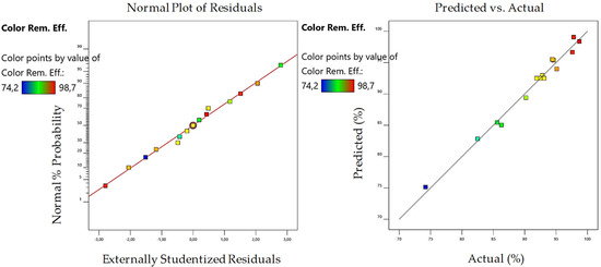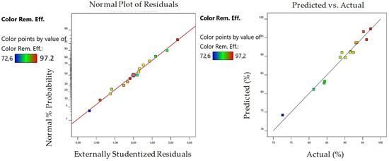 The residual plots and predicted vs. actual plots obtained for the color parameter are shown in Figure 6, showing that the model results are representative of the experimental results.