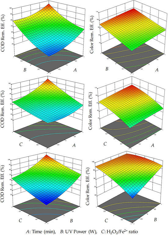 An optimization study was carried out in consideration of time (min), H2O2/Fe2+ ratio, and UV power (W) and an equation was obtained (Equation (1)). Accordingly, “A” represents time, “B” represents UV power, and “C” represents H2O2/Fe2+ ratio.
