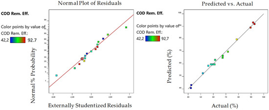 Normal probability residual plot and predicted vs. actual plot based on chemical oxygen demand (COD) removal efficiency values for the MV/Fenton process.