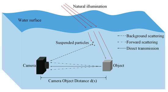 As shown in Figure 2, Jaffe et al. [] proposed a model for underwater imaging under scattering media called the Jaffe-McGlamery model, which decomposes the light received by an underwater camera and abstracts the process of underwater image formation as: