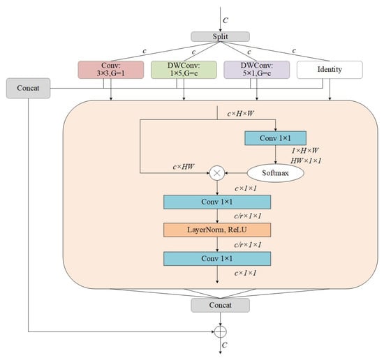 This module aims to capture information at various scales and sizes within the image and effectively model long-range dependency with fewer learning parameters. First, in order to reduce memory access and obtain features with different receptive fields, we split shallow feature maps into four branches. Conventional convolution and depthwise convolution operations are utilized for extracting features from the first three branches, while the maps of another branch, referred to as identity mapping, remain unchanged. As shown in Figure 3, the kernel size of the conventional convolution is . To speed up computation, we used depthwise convolutions with and (where in this paper, please refer to ablation study for details.) instead of depthwise convolutions. Then, a convolutional layer followed by the Softmax function is applied on the multi-branch feature maps for obtaining attention weights, after which attention pooling is conducted to derive global context features. Subsequently, a two-layer bottleneck is employed to transform the obtained global context features. Finally, the obtained multi-branch context features are aggregated to all positions by addition, thus efficiently capturing long-range dependency.