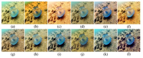Qualitative comparison of the results generated by different approaches on the degraded image from T-U190. (a) degraded image, (b) UDCP [], (c) ULAP [], (d) Water-Net [], (e) UGAN [], (f) FUnIE-GAN [], (g) Ucolor [], (h) CWR [], (i) USUIR [], (j) Peng et al. [], (k) Ours, (l) Reference image.