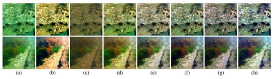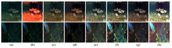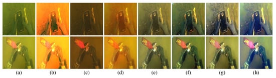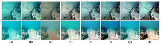 Qualitative comparison of different approaches on shallow water images. (a) degraded image, (b) ULAP [], (c) Water-Net [], (d) FUnIE-GAN [], (e) Ucolor [], (f) CWR [], (g) Peng et al. [], (h) Ours.