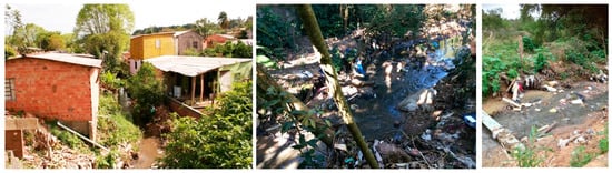 The Taquara Stream is one of the main watercourses in Lomba do Pinheiro, a neighborhood of the city of Porto Alegre, southern Brazil (Figure 1). It flows through an area of intense informal urbanization and is currently in a state of severe ecological deterioration (Figure 2). The case of the Taquara Stream represents a pressing problem in many cities in Brazil, as well as in countries of the Global South, that are marked by the widespread environmental degradation and contamination of urban watercourses caused by the lack of urban infrastructure, inadequate sewage systems, the direct disposal of sewage and solid waste into water bodies, the irregular occupation of embankments, and the suppression of riparian vegetation [,]. This situation constitutes a characteristic pattern of socio-environmental vulnerability including poverty, precarious housing, population exposure to risks (such as landslides and floods), and the emergence of areas prone to the dispersal of pathogens [].
