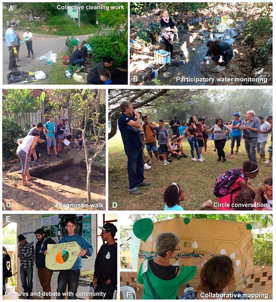The actions of the WG sought to change the predominantly top–down logic used to implement solutions to such problems, often neither inclusive nor based on a relational approach between involved actors. Conversely, it sought to implement actions focused on collaborative learning in parallel with the more immediate technical actions required by the current local conditions. The WG mobilized a variety of participatory activities adapted to the local circumstances, which were co-created by the participants and guided by an approach committed to the collective construction of knowledge that sought to give the local community a leading role, including marginalized groups that are usually excluded from the discussion and from decision-making processes on issues that directly affect them. These activities ranged from small-scale (involving up to 30 people) to large-scale mobilizations (involving up to 400 people), depending on their objective and target group (Figure 4). The former included, for example, cleaning up specific areas along the stream, talking to residents, and carrying out diagnostic walks and collaborative mapping (Figure 4A–C,F). The large-scale mobilizations included, for example, multi-stakeholder seminars to share the research results developed by support groups from local educational institutions (Figure 4D,E). Thematic events and protest walks were also organized. Such activities proved effective in establishing dialogue with the vulnerable populations living along the banks of the stream. The value of these larger actions has been the creation of opportunities for wider knowledge sharing and movement growth within and beyond the Lomba do Pinheiro community.