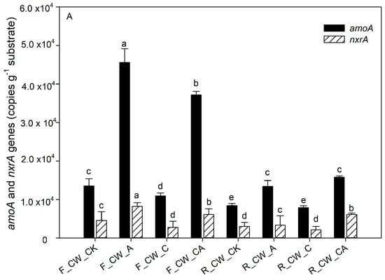 The contribution of nitrifiers and denitrifying bacteria to nitrogen removal was indicated by the abundance of functional genes related to nitrogen [45,46]. The absolute abundance of amoA, nxrA, nirS, nirK and nosZ at both the fore and rear ends of HSSFCWs is depicted in Figure 4. The functional genes amoA and nxrA are associated with the nitrification process. The process of aeration (CW_A and CW_CA) significantly increased the absolute abundance of amoA (p < 0.05) at the fore ends of HSSFCWs. The absolute abundance of amoA in CW_A and CW_CA amounted to 4.56 × 104 and 3.72 × 104 copies·g−1 substrate, respectively. The absolute abundance of amoA in all treatments decreased in the rear ends of HSSFCWs, but the abundance of amoA in the CW_A and CW_CA treatments remained higher than that in other treatments at the rear ends of HSSFCWs. The absolute abundance of amoA in CW_A was higher than that in CW_CA at the fore ends of HSSFCWs, while the opposite results appeared at the rear ends of HSSFCWs. These results indicated that the addition of carbon sources partially inhibited nitrification even under the aeration condition. nxrA is another important gene related to nitrification. Aeration significantly increased the abundance of nxrA at the fore ends of HSSFCWs. The absolute abundance of amoA in CW_A and CW_CA treatments was higher than that in other treatments. The highest absolute abundance of nxrA in the fore and rear ends of HSSFCWs was observed in the CW_A and CW_CA treatments, reaching 8.22 × 103 and 6.07 × 103 copies·g−1 substrate, respectively. The aeration process provided sufficient DO to facilitate the proliferation, breeding, and biochemical activities of aerobic ammonia-oxidizing bacteria, thereby enhancing their activity [36]. The copy number of the amoA gene was 2.60 to 6.12 times higher than that of nxrA, aligning with the findings of Pelissari et al. [47]. Ammonia-oxidizing bacteria oxidize NH4+-N to NO2--N, thereby providing substrates for nitrite-oxidizing bacteria to oxidize NO2--N to NO3−-N [48]. At the rear ends of HSSFCWs, a steady decrease was observed in the disparity between the absolute abundance of amoA and nxrA, indicating that the conversion rate of NH4+-N to NO2−-N by ammonia-oxidizing bacteria was reduced in the rear ends of HSSFCWs.