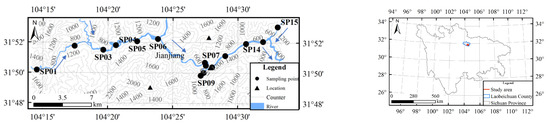 Map of the study area (left), the blue arrow indicates the direction of water flow) with location in Sichuan Province (right).