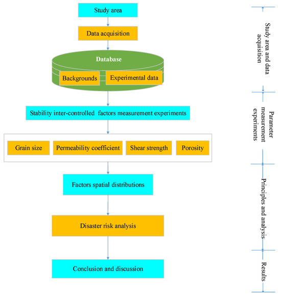 The flow chart for studying stability inter-controlled factors of fine-grained sediments is shown in Figure 2. On the basis of obtaining remote sensing, DEM, and geological background data of the study area, experiments are carried out to measure the stability inter-controlled factors, such as grain size, permeability coefficient, shear strength, and porosity. Based on these, the spatial distribution patterns of stability inter-controlled factors of fine-grained sediments are summarized, and the risk of debris flow disasters is analyzed to provide a scientific basis for the prevention and control of geological disasters in the study area.
