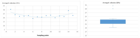 Spatial distribution pattern of averaged cohesion of fine-grained sediments (left) and its box–whisker plot (right).