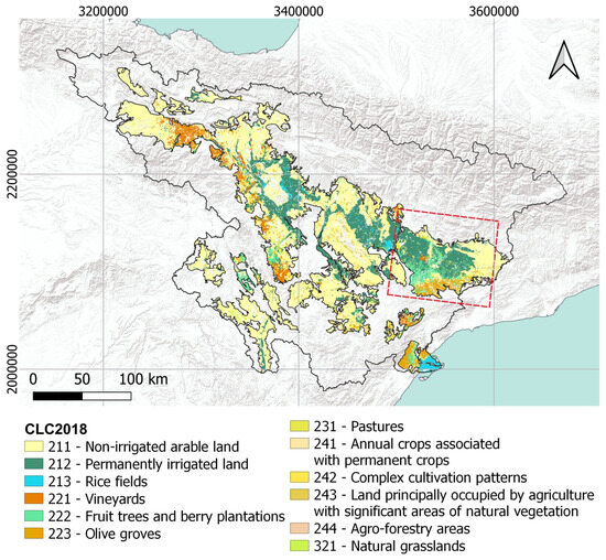 With a total drainage area of about 86,000 km2, the Ebro basin is the largest Mediterranean catchment of Spain; it is prevalently characterised by a cold semi-arid climate with an oceanic climate area in its Northern portion [42], where several reservoirs store water from the Pyrenees to be delivered to the crops located downstream in the central valley through a complex network of irrigation canals [39]. The analysis presented in this study is carried out on the basin’s flat agricultural portions only, which are shown in Figure 1. Such a domain includes both irrigated and non-irrigated areas; it is outlined through the 100 m resolution Corine Land Cover data set referring to the year 2018 (CLC 2018), distributed by the Copernicus Land Monitoring Service (https://doi.org/10.2909/960998c1-1870-4e82-8051-6485205ebbac (accessed on 13 November 2019). The land cover types that are considered are listed in the figure’s legend. It is important to specify that the information from the CLC 2018 is only used to delineate the spatial domain of agricultural areas (rainfed and irrigated) to be considered; as a benchmark for the actual extent of irrigated areas, we use more site-specific and accurate data sets as described in Section 2.3. Moreover, a double-scale analysis is carried out. First, the area enclosed by the red box of Figure 1 is considered in order to compare results with outcomes of Dari et al. [27]; such portion, whose extension is 10,000 km2, encloses a wide irrigated area shared between the Catalonia and Aragon regions and is henceforth denominated “Ebro_CATAR”. Then, a basin-scale application is performed (see Section 2.3 for further details).