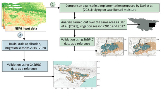 The aim of this work is to actually demonstrate the flexibility of the TSIMAP method, whose applicability is not limited by a single type of input data. In order to achieve this, a twofold analysis carried out over the Ebro basin (Spain) by exploiting 1 km NDVI (Normalised Difference Vegetation Index) from the Copernicus Global Land Service (CGLS) is proposed. First, a comparative analysis with outcomes from the method’s implementation relying on satellite soil moisture by Dari et al. [27] is carried out. The comparison is focused over the same period (2016–2017) and the same portion of the Ebro basin considered in a previous study by the authors. As a second step, a basin-scale application considering the irrigation seasons in the time span of 2015–2020is performed.