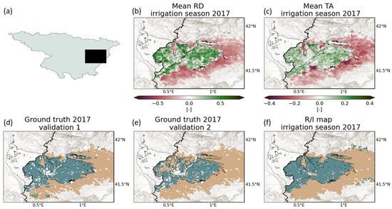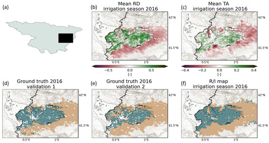 Results obtained in this study over the Ebro_CATAR domain and referring to the irrigation season of 2016: panel (a) provides the location of the Ebro_CATAR area, panels (b,c) show the mean relative differences (RD) and the mean temporal anomalies (TA), respectively, during the highest-intensity irrigation season (May–September), panels (d,e) show the SIGPAC ground truth maps according to Validations 1 and 2, and panel (f) shows the resulting rainfed/irrigated (R/I) map. We note that in panels (d–f), light brown and blue green are used to indicate rainfed and irrigated areas, respectively.