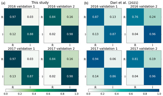 Panel (a): Confusion matrices synthesising the accuracy of the classifications into rainfed (R) and irrigated (I) areas according to the two validation approaches implemented. Panel (b): same but referring to the classifications proposed in Dari et al. [27] modified considering rainfed (R) and irrigated (I) areas only. For both panels, the first row refers to 2016, while the second one refers to 2017; ground truth classes are represented on the y-axis, while the classes obtained through the TSIMAP method are shown on the x-axis.