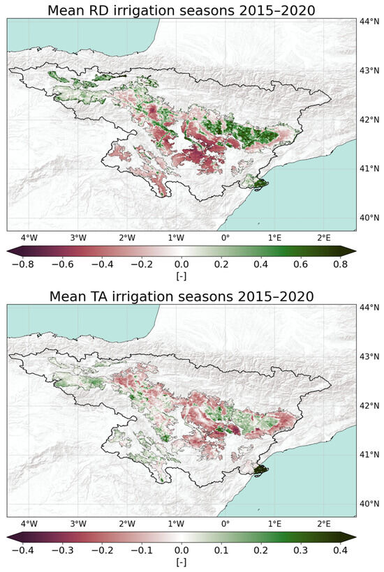 Mean relative differences (RD) and temporal anomalies (TA) during the highest-intensity irrigation seasons (May–September) of the period of 2015–2020.
