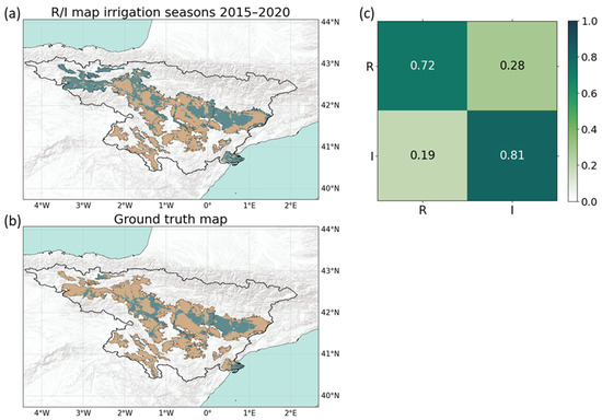 Assessment of results of the basin-scale application: panel (a) shows the map of rainfed (R, indicated in light brown) irrigated (I, indicated in green blue) areas produced through the TSIMAP method and panel (b) provides the CHEBRO ground truth map. Panel (c) shows the corresponding confusion matrix, with ground truth classes on the Y-axis and predicted ones on the X-axis.