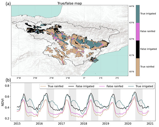 Panel (a) shows the map of true irrigated, false rainfed, false irrigated, and true rainfed areas. Panel (b) provides the 14-day aggregated NDVI time series averaged over each domain.