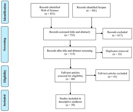 A systematic review was carried out to answer the research question. Systematic reviews provide an overview of a clearly formulated scientific question that systematically identifies, selects and critically assesses relevant research results using specific methods []. In the context of this work, a systematic review was conducted according to the guidelines of the Collaboration for Environmental Evidence []. These guidelines are freely available and therefore comprehensible and reproducible and are similar to other guidelines for systematic review procedures []. The method originally comes from and was mainly used in the health or medical sciences. However, it is now also regularly used in the environmental and natural sciences []. This specific, robust and transparent method was chosen in order to obtain a broad and transparent overview of the findings published in scientific studies in English and indexed in databases. However, it is not possible with this method to cover all the scientific literature ever published on the subject. There are a number of issues that need to be considered when using the method and evaluating the results. Due to the limitation to English language articles, a certain amount of research not published in English will not be included. Keywords must be chosen very carefully and should also be tested, as the use of inappropriate keywords may result in some relevant articles not being found, as the technical terms of systems in geographical regions differ. The definition of specific characteristics and conditions that leads to studies being included in an analysis or not depends on the judgement of the respective researchers and is therefore a source of variation in the final results. In this paper, the conditions were formulated on the basis of thematic relevance to the research question and the quantitative analysis of BGI tree systems. The limitation of the literature search to a certain number of databases also means that some studies not published in the journals listed in the databases were not included in the analysis. To answer our research question, we used the keyword combination (“urban tree*” OR “city tree*”) AND (stormwater OR runoff OR rain* OR precipitation OR cloudburst). These keywords were then used to search for studies in scientific databases. The databases searched were Web of Science Core Collection (www.webofknowledge.com) and Scopus (www.scopus.com). The articles were searched in the databases according to the occurrence of the given keyword combinations within the information, i.e., whether the keywords occur in the title, article keywords or summary of the articles. In the next step, the studies were selected from the database search over several stages with regard to thematic relevance and the possibility of extracting qualitative and/or quantitative statements. In the first step (screening), all titles found in the databases were checked, and obviously unsuitable articles were cast aside. After that, all abstracts were read to check suitability. Unsuitable studies were again eliminated. After removing duplicates, all remaining studies were classified as possibly relevant for extraction of qualitative and quantitative data and analyzed on the basis of their full text. In the end, 39 studies were included in the analysis. A list of these studies can be found in List S1 in the Supplementary Materials. The procedure for selecting the scientific studies is illustrated in Figure 1.