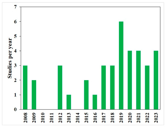 Publications included in the descriptive analysis were published between 2008 and 2023. There seems to be growing interest in the topic in the scientific literature, which can be seen in the number of publications per year from 2017 onwards, as shown in Figure 2. This is also the case in other systematic reviews about NbS or BGI, e.g., [,]. This could be an indication of the increasing global importance of climate change impact adaptation measures.