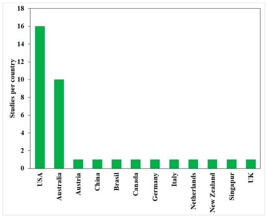 The geographical focus of the studies is apparent (Figure 3). By far, most studies were conducted in the United States (16) and Australia (10). Other countries are only represented by one study each in this review. This indicates a much longer tradition of BGI systems combined with trees in the USA and Australia. This may be due to the fact that in some countries, the tradition of scientific publication in the field of vegetation engineering is not as strong as in the USA and Australia. In addition, in some countries, these systems have only been the focus of scientific attention for a few years, and therefore few studies have been published in English. The authors can report this to be the case for some European countries, such as Germany. In general, while studies on BGI tree systems can be found in Asia, Europe and North America, regions and cities in the southern hemisphere have hardly been investigated in this respect (or the studies have not been published in the international peer-reviewed literature).