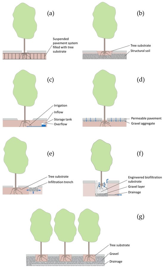 Sketch of principles and basic technical details of BGI tree systems: suspended pavement systems (a), structural soil systems (b), rainwater harvesting systems (c), permeable pavement systems (d), infiltration trenches (e), biofiltration systems (f) and tree trenches (g).