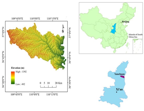 Yanchuan County is situated in the northeastern part of the Yan’an region, within the northern reaches of Shaanxi Province, China. Its geographical coordinates range from 109°36′20” to 110°26′44” east longitude and from 36°37′15” to 37°5′55” north latitude, encompassing a total land area of approximately 1985 km2 (Figure 1). The topography of this region exhibits significant variations in altitude, with elevations ranging from 492 m to 1392 m. The terrain presents a distinct pattern, with higher elevations prevailing in the northwest and gradually decreasing towards the southeast. The terrain predominantly slopes from the northwest to the southeast. Notably, the steepest slopes in this area exhibit angles reaching up to 68.30°, while a substantial portion, approximately 58.19% of the total area, comprises slopes with angles less than 20°. Areas characterized by slope angles between 20° and 60° encompass roughly 41.80% of the study area.