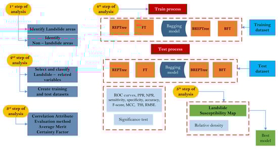 The proposed methodology follows a five-step analysis, which involves: (i) constructing the landslide and non-landslide inventory, (ii) data selection and classification, (iii) correlation attribute evaluation process, certainty factor analysis and normalization (iv), applying the tree-based and hybrid models to produce the four landslide susceptibility models and estimating the learning and predictive performance of the four models (v), generate the susceptibility maps and calculate the relative landslide density. A detailed description of our modeling methods is provided below, complemented by Figure 2, which illustrates the flowchart of our hybrid-ensemble model approach.