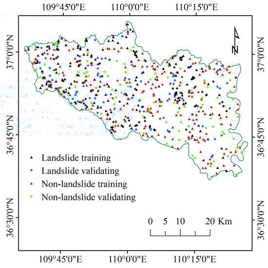 The accuracy and reliability of a landslide susceptibility model are greatly influenced by the quality of the landslide inventory map, which is essential for recording vital information about various aspects of landslides, including their types, occurrence timing, and precise locations [,,,]. A fundamental assumption underlying landslide susceptibility modeling is that future landslides will exhibit patterns similar to those observed in the past [,]. Consequently, the composition of the landslide inventory map primarily draws from historical records, field surveys, and the interpretation of remote sensing imagery, resulting in a comprehensive dataset comprising a total of 311 distinct landslide areas. It is important to note that these areas have been represented as single points, referencing the centroid of each respective landslide region. To develop the landslide susceptibility model, we employed random sampling techniques, selecting 218 landslide disaster points, which account for 70% of the dataset, using the Subset Features in the Geostatistical Analyst toolbox of the ArcGIS suite. The remaining 93 points, constituting 30% of the dataset, were set aside for model verification purposes. Non-landslide areas were identified through a combination of methods. These methods included random point selection within the study area, ensuring that these points did not coincide with known landslide locations. Additionally, satellite imagery analysis of Landsat 8 images, obtained from the International Scientific and Technical Data Mirror Site of the Computer Network Information Center, Chinese Academy of Sciences, available at http://www.gscloud.cn (accessed on 22 August 2023), was employed to pinpoint regions characterized by stable vegetation cover, flat terrain, or solid bedrock—criteria that, in theory, denote areas less susceptible to landslides and thus suitable for classification as non-landslide areas. The spatial distribution of the landslide and non-landslide datasets is illustrated in Figure 3.
