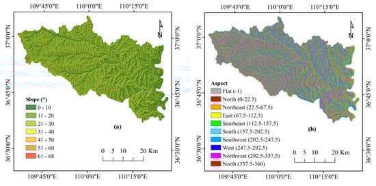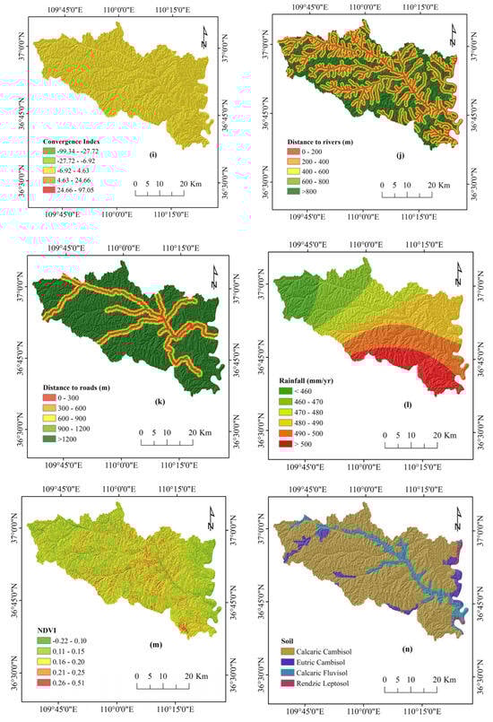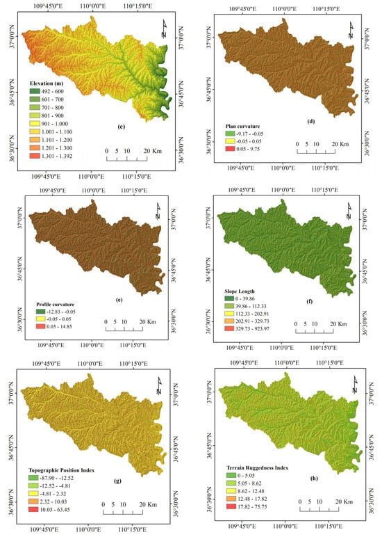 The occurrence of landslide disasters in Yanchuan County is linked to a combination of local geological, topographic, and environmental factors [,]. The selection of appropriate conditioning factors for landslide susceptibility modeling is a critical step, as these factors may exhibit interdependencies that could impact predictive accuracy [,,]. Consequently, this study carefully selected 16 landslide conditioning factors to create thematic maps for landslide susceptibility modeling (Figure 2), which include slope, aspect, elevation, plan curvature, profile curvature, slope length, the topographic position index (TPI), terrain ruggedness index (TRI), convergence index (CI), distance to rivers, distance to roads, rainfall, the normalized difference vegetation index (NDVI), soil type, lithology, and land use. The main data sources for the 16 landslide—related factors included digital elevation model (DEM) data, Landsat 8 Operational Land Imager imagery with a 30 m by 30 m resolution, a 1:200,000 geological map, 1:100,000 land use/land cover map, and 1:1,000,000 soil type map. Utilizing geospatial transformation functions available in the ArcGIS suite, we categorized the 16 landslide conditioning factors into thematic layers, distinguishing between continuous and discontinuous data.