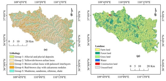 Thematic maps: (a) slope, (b) aspect, (c) elevation, (d) plan curvature, (e) profile curvature, (f) slope length, (g) topographic position Index, (h) terrain ruggedness Index, (i) convergence index, (j) distance to rivers, (k) distance to roads, (l) rainfall, (m) NDVI, (n) soil, (o) lithology, and (p) land use.