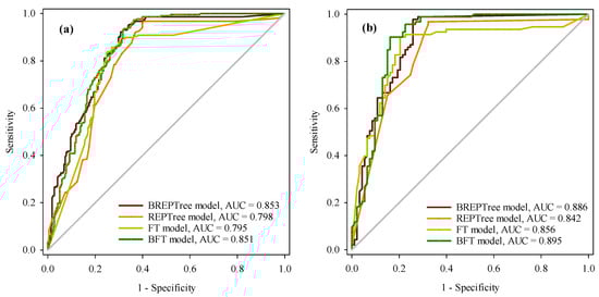 The results of the ROC curve analysis for both the training and validation datasets revealed important insights into model performance (Figure 5 and Table 4 and Table 5). In the success rate curve (Figure 5a), the BREPTree model demonstrated the highest AUC value of 0.853, closely followed by the BFT model with an AUC of 0.851. The REPTree model achieved an AUC of 0.798, and the FT model recorded an AUC of 0.795. Furthermore, the BREPTree model exhibited the smallest standard error (0.018), underscoring the precision and reliability of its AUC estimate. The narrow 95% confidence interval (0.816 to 0.889) and the highly significant p-value (“<0.0001”) further supported the robustness of the BREPTree model. In the prediction rate curve (Figure 5b), the BFT model outperformed all others with the largest AUC value of 0.895, followed by the BREPTree model with an AUC of 0.886. The FT model exhibited an AUC of 0.856, while the REPTree model achieved an AUC of 0.842. Importantly, the BFT and BREPTree models exhibited the same and minimal standard error (0.025), suggesting a high confidence level in their AUC estimates. The significance levels of these parameters, as indicated by the low p-values, underscore the robustness of the models. These findings collectively demonstrate that all models in the study perform reasonably well, with the hybrid BFT model consistently exhibiting the highest AUC values, indicating its superior predictive accuracy.