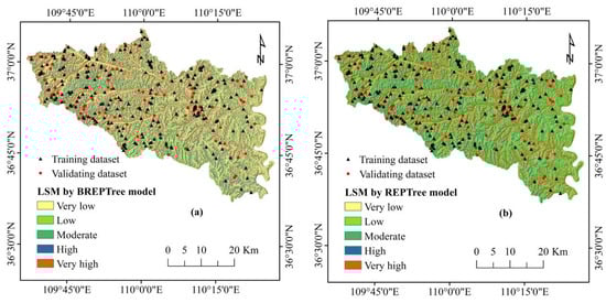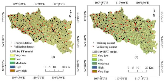 Landslide susceptibility maps: (a) BREPTree model, (b) REPTree model, (c) FT model, and (d) BFT model.
