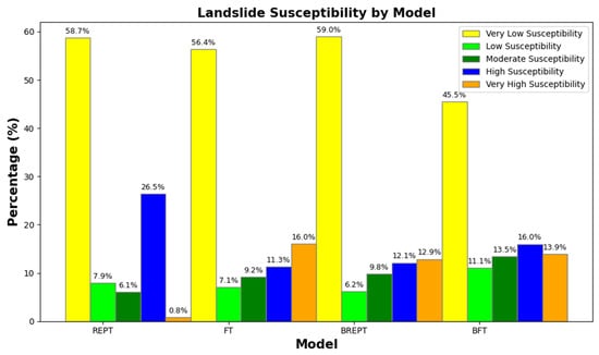 The resulting susceptibility maps illustrate the spatial distribution of landslide susceptibility across the study area (Figure 6a–d). For the REPTree model, the majority of the area falls under the very low susceptibility category (58.74%), followed by low (7.92%), medium (6.08%), high (26.46%), and very high (0.81%) susceptibility. Similarly, the BREPTree model designates the largest portion of the area as very low susceptibility (58.99%), with the rest classified as low (6.20%), medium (9.81%), high (12.13%), and very high (12.87%) susceptibility. In the case of the FT model, the susceptibility classes consist of very low (56.40%), low (7.08%), medium (9.18%), high (11.31%), and very high (16.03%). Finally, the BFT model categorizes the study area into very low susceptibility (45.52%), low (11.11%), medium (13.47%), high (15.99%), and very high susceptibility (13.91%) (Figure 7, Table 8). Each of the four landslide susceptibility maps reveals that while the very low susceptibility class dominates the landscape, there are variations in the overall distribution of susceptibility levels among the models. Notably, the bagging algorithm employed in the integrated models (BREPTree and BFT) demonstrates its effectiveness by improving the predictive accuracy and fine-tuning the susceptibility classification.