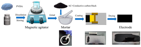 Carbon particulate activated with CeO2 was produced via the sol-gel process. In 25 mL of deionized water, 0.31 g and 0.62 g of cerium nitrate hexahydrate and 0.45 g and 0.9 g of citric acid monohydrate were dissolved, respectively. To ensure uniform mixing, the two solutions were mixed using a magnetic agitator for one hour, followed by continuous stirring in a water bath maintained at 70 °C. The activated carbon powder was introduced into the mixture prior to the formation of the gel, and the process was maintained until a moist gel was formed. To acquire the dry gel, the obtained wet gel was dried in a blast drying oven at 105 °C for two hours. In the end, it was naturally chilled to room temperature after being heated to 650 °C at a rate of 5 °C/min in a nitrogen atmosphere for two hours in order to obtain activated carbon powder doped with 15% and 10% CeO2. The coating method was utilized to prepare a CeO2 activated carbon electrode, as illustrated in Figure 1. The mass ratio of the three components, conductive carbon black, activated carbon powder, and polyvinylidene fluoride, was calculated to be 8:1:1. A volume of 3 mL of dime-thylacetamide (DMAC) was measured using a pipetting gun before being transferred to a beaker. A total of 0.1 g of PVDF was accurately weighed with an electronic balance and slowly added to DMAC while stirring. When the PVDF was completely dissolved, the solution was poured into a quartz mortar filled with 0.8 g of activated carbon powder and 0.1 g of conductive carbon black and ground in the mortar until a honey-like, thick paste was formed. Before applying, tape a piece of graphite paper to the glass plate with scotch tape. Use the coating method to pour the grout onto the graphite paper. The coating thickness was set to 400 μm. The electrodes were coated and subsequently dried at ambient temperature for 30 min. They were then subjected to overnight heating in a drying oven at 100 °C to facilitate cross-linking and obtain CeO2/AC electrodes. The electrode material was named CeO2 (X)-AC (X = 0, 5, 10), respectively, according to the different CeO2 doping mass ratios.