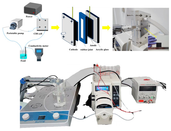 Figure 2 displays the experimental gadget that was specifically designed and built for this purpose. The CDI module consists of a set of symmetrical electrodes, a rubber divider, and a plexiglass cover, all securely fastened with screws. The electrode size is 5 × 6 cm2, and the active substance mass is 0.195 g. The CDI test apparatus consists of a CDI module, a DC power source, a conductivity meter, a peristaltic pump, and a magnetic stirrer. The DC power supply ensures a consistent voltage supply to the CDI system, the peristaltic pump maintains a steady flow of water into and out of the system, the conductivity meter monitors variations in the solution’s conductivity, and the magnetic stirrer maintains uniformity in the solution. The electro-adsorption test is conducted on the experimental apparatus. Equations (1) and (2) provide the means to determine the electrode’s adsorption capacity for SO42− (mg/g) and its related electro-adsorption rate (mg/g/min):