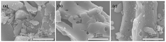 According to the analysis of Figure 3a–c, it can be seen that AC, as shown in Figure 3a, has a smooth surface and small pore size, while CeO2(5)-AC, as shown in Figure 3b, has a small number of fine particles on the surface and pores, indicating that CeO2 exists on the surface of activated carbon or enters the pores in the form of fine particles. Figure 3c shows the increase in fine particles on the surface and pores of CeO2(10)-AC. The pore size of CeO2(5)-AC and CeO2 (10)-AC surfaces is larger than that of AC, because the pore size is enlarged by the gas overflow during the high-temperature sintering process. Appropriate CeO2 increases the conductivity without clogging the pores and is more conducive to the treatment of high-sulfate mine water.