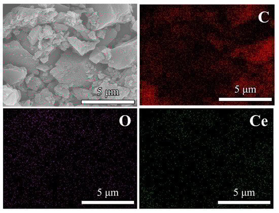 The examination of Figure 4 reveals that carbon, oxygen, and cerium exhibit a uniform distribution on CeO2(5)-AC. The study of Figure 3 reveals that the diffraction peaks of all samples are broad and indistinct, suggesting that activated carbon predominantly occurs in an amorphous state. The presence of peaks at 2θ = 22.7° in the AC sample suggests that the carbon can be classified as graphitized carbon. Furthermore, a distinct peak was detected at an angle of 2θ = 26.6°, indicating the presence of the (002) crystal face of graphite structures. Additionally, a smaller and narrower peak was discovered at an angle of 2θ = 43.8°, which corresponds to the (100/100) crystal face of graphite structures, as commonly observed [35]. The presence of distinctive diffraction peaks at 2θ values of 28.5°, 33.3°, 47.5°, and 56.2° after CeO2 doping indicates the crystalline form of cerium as CeO2. The results indicate the successful preparation of the CeO2(5)-AC material.