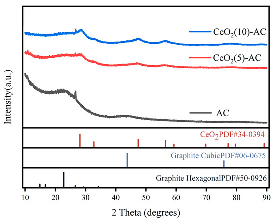 XRD patterns of AC, CeO2(5)-AC, and CeO2(10)-AC.