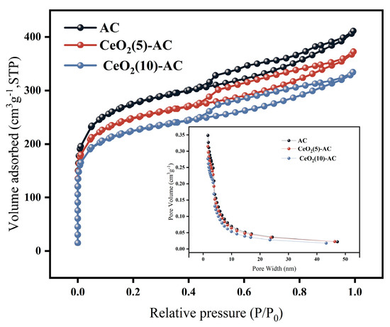 The pore size distributions and N2 adsorption-desorption isotherms for AC, CeO2(5)-AC, and CeO2(10)-AC (illustration).